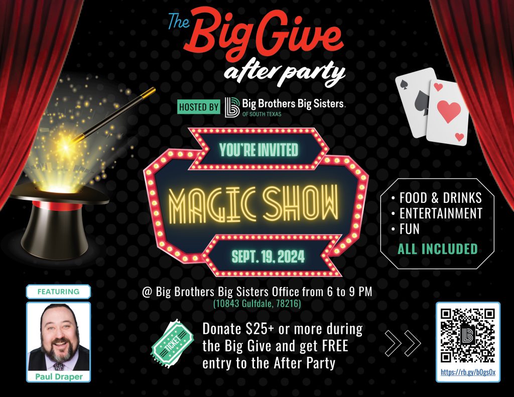 The Big Give is a city wide donation drive, and your donation* to Big Brothers Big Sisters during this event will grant you access to an unforgettable magic show, tantalizing food, delightful drinks, vibrant music, and good company celebrating non-profits. This is an event you won’t want to miss!
