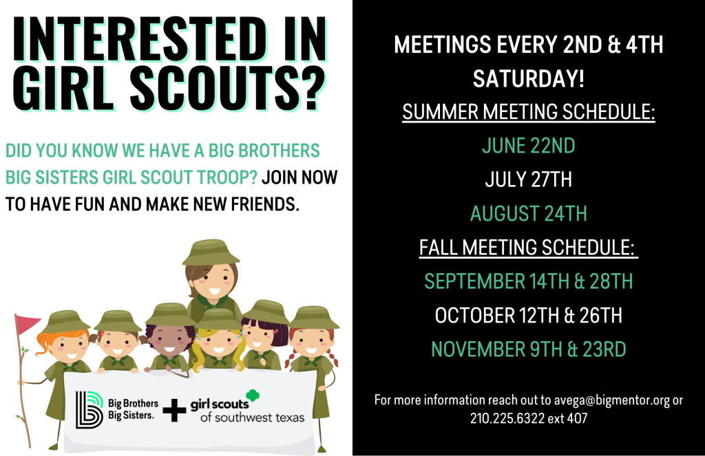 *A tentative schedule of the meetings is above and meetings will be held at the BBBS office (10843 Gulfdale, 78216) but there may be small field trips monthly that the troop will go on.*